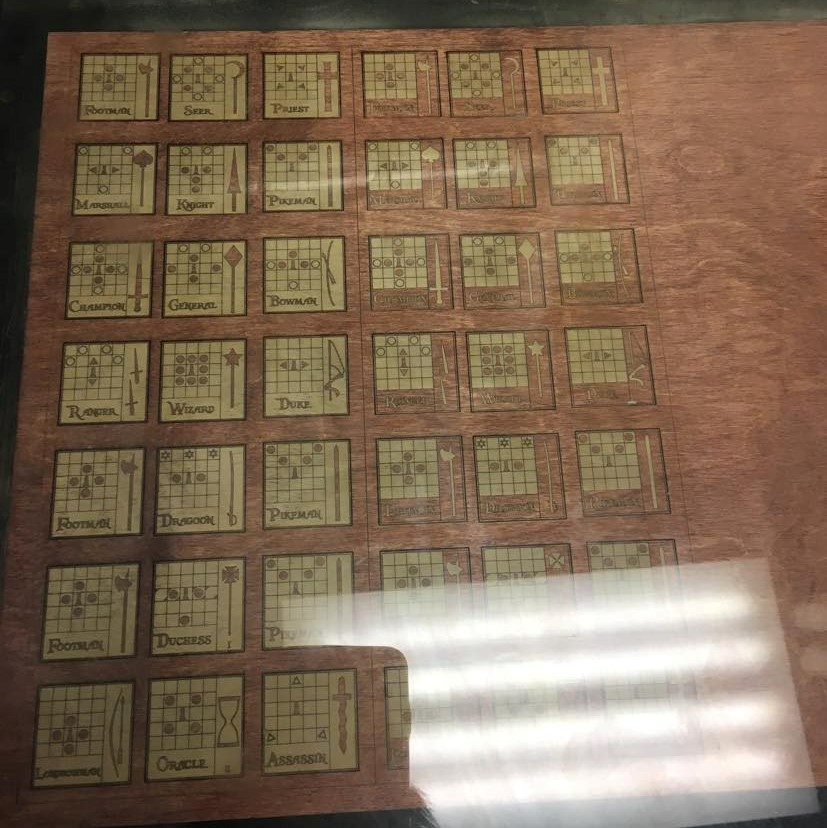 Before etching the tiles, I made sure to stain the Baltic birch plywood the desired color (light brown). As the areas are etched away, the top surface of the plywood with the stain will burn off leaving the lighter birch color remaining, creating a nice contrast. All the tiles were cut out from 1/4″ thick (~12 mm) thick plywood. If you note the pieces carefully, I raster etched the grid background for both light and dark tiles, but flipped the foreground/background for the remainder of the tile. This was done as the movement symbols change depending on if the dots are filled in or not.