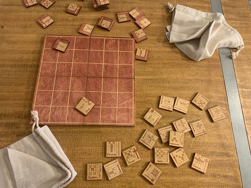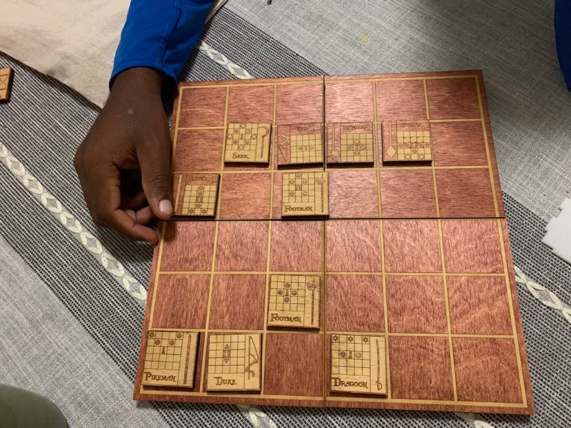 The goal of the game is to capture the opponent’s Duke. The board consists of a 6 x 6 grid, and players start with their Duke and two Footman tiles. Players begin with placing their Duke in one of the two middle squares on their side of the game board along the row closest to them; note that players’ tiles are always oriented with the text right-side up with respect to the player who controls the tile. Then, the players’ two respective Footman tiles are placed edge adjacent to their Duke. Whenever a tile is first placed upon the game board, it is placed with the dark pawn up – this is the starting side of the tile.