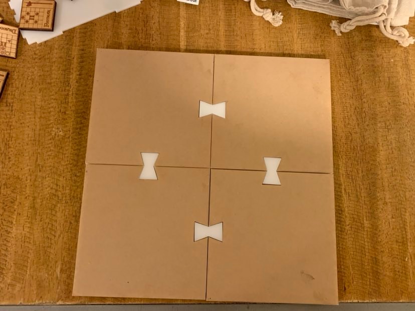The gameboard consists of four quadrants that are fitted together with the aid of four butterfly joints made from acrylic, hence the requirement of the bottom layer. I found that the four quadrant pieces helped minimize the space of the game for packaging.