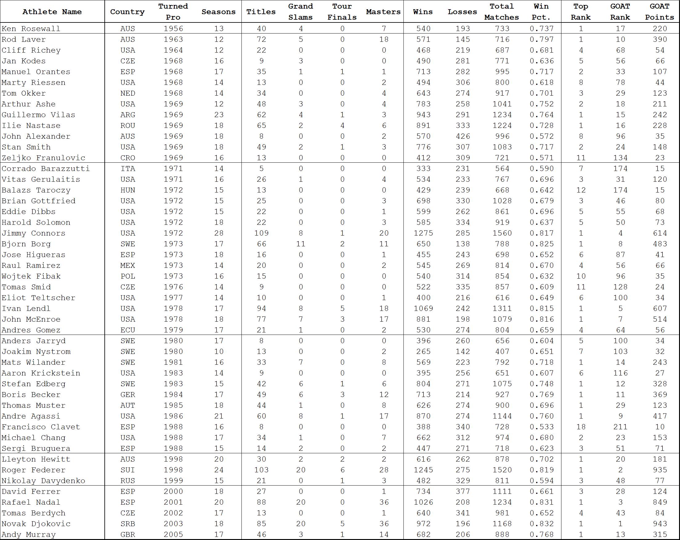 These are the list of players I included, by chronologic order of turning professional, along with some of their career statistics. The horizontal dividers separate out players by decade with respect to year turned professional.