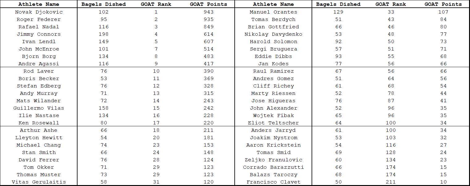 It is of little surprise that we find such names as Federer, Nadal, Djokovic, Connors, and Lendl on this list. Yet other all-time great players are noticeably absent; of the 48 players with at least 50 bagels, the average GOAT rank is 52nd (range: 1 to 211). Eighteen of the top twenty players ranked by GOAT status are found within the list of 48 players. The two unlisted top-twenty GOATs, Pete Sampras (rank 6, 523 GOAT points) and John Newcombe (rank 19, 210 GOAT points), have 37 and 32 bagels to their names, respectively.