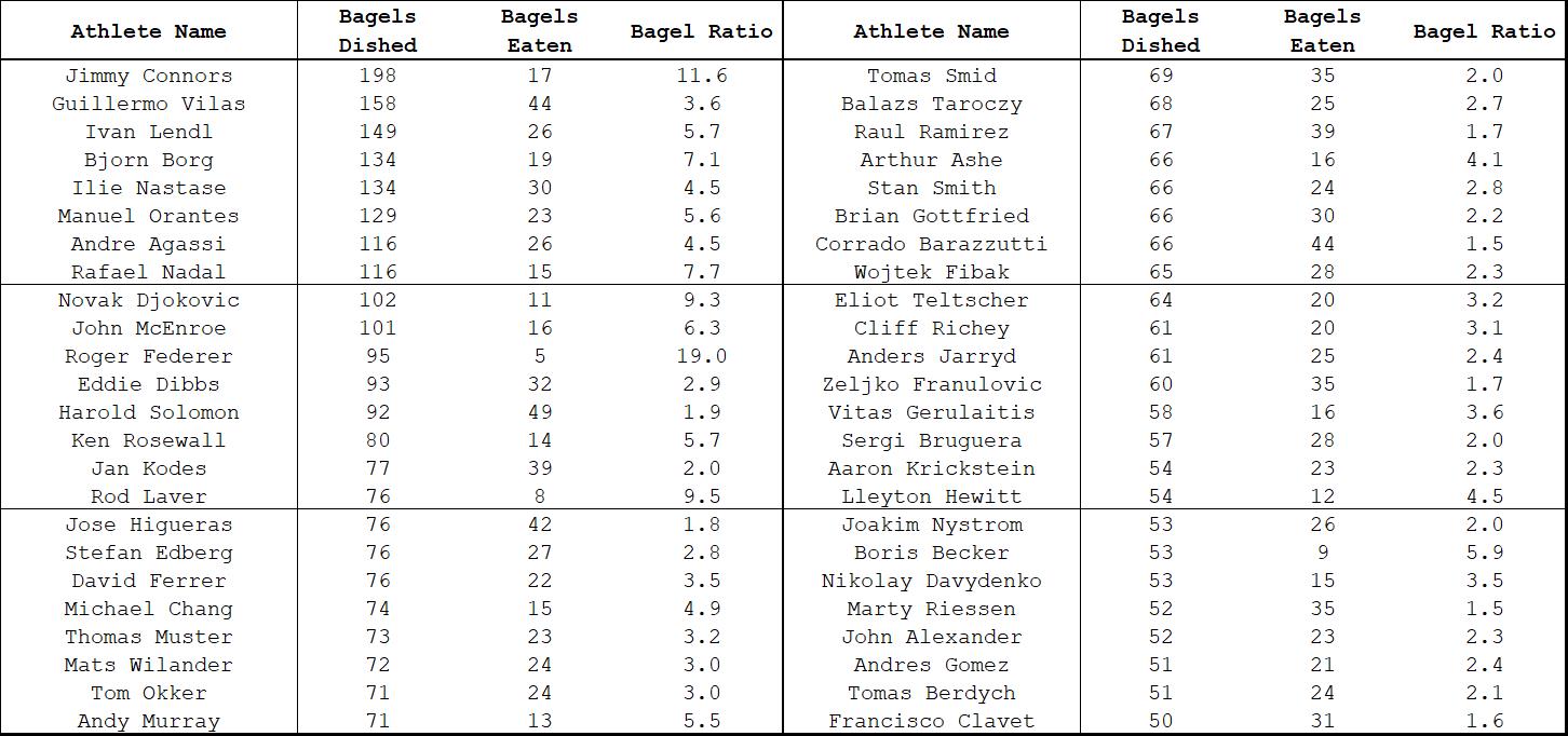To preface, I only used the list of players who have dished out at least fifty bagels in their career, which is a list comprised of only 48 ATP players. I wanted to focus on these individuals as they consist of many of the top players in tennis history, so I felt that analyzing their bageling tendencies, whether in consumption of bagels or in dishing out bagels, would be a fun and tasty exercise.