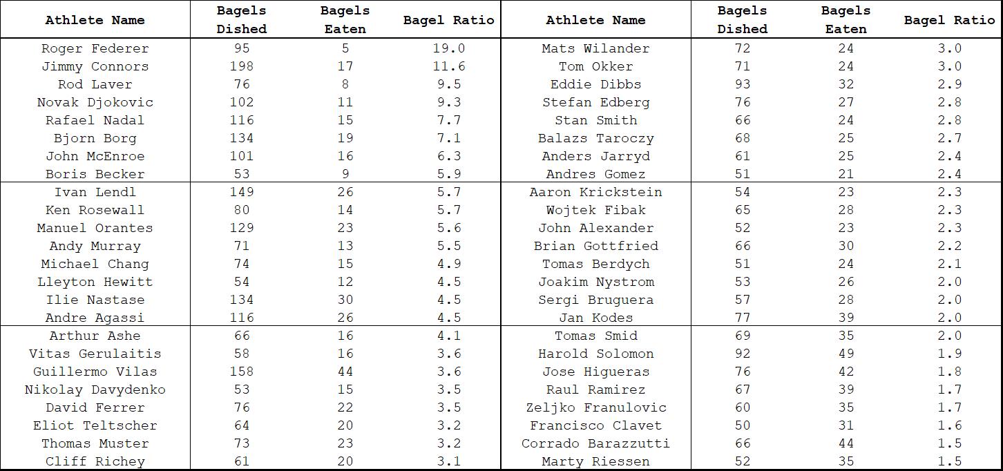 I found that the bageling ratio, or the ratio between bagels dished: bagels eaten to be a fairly compelling statistic. If we order by the bageling ratio, we find Roger Federer at the top of the list, no doubt due to only suffering five bagels eaten over his illustrious career. In fact, of the top 48 bagelers, only Rod Laver and Boris Becker have fewer than ten bagels eaten, whereas everyone else is in the double-digits.