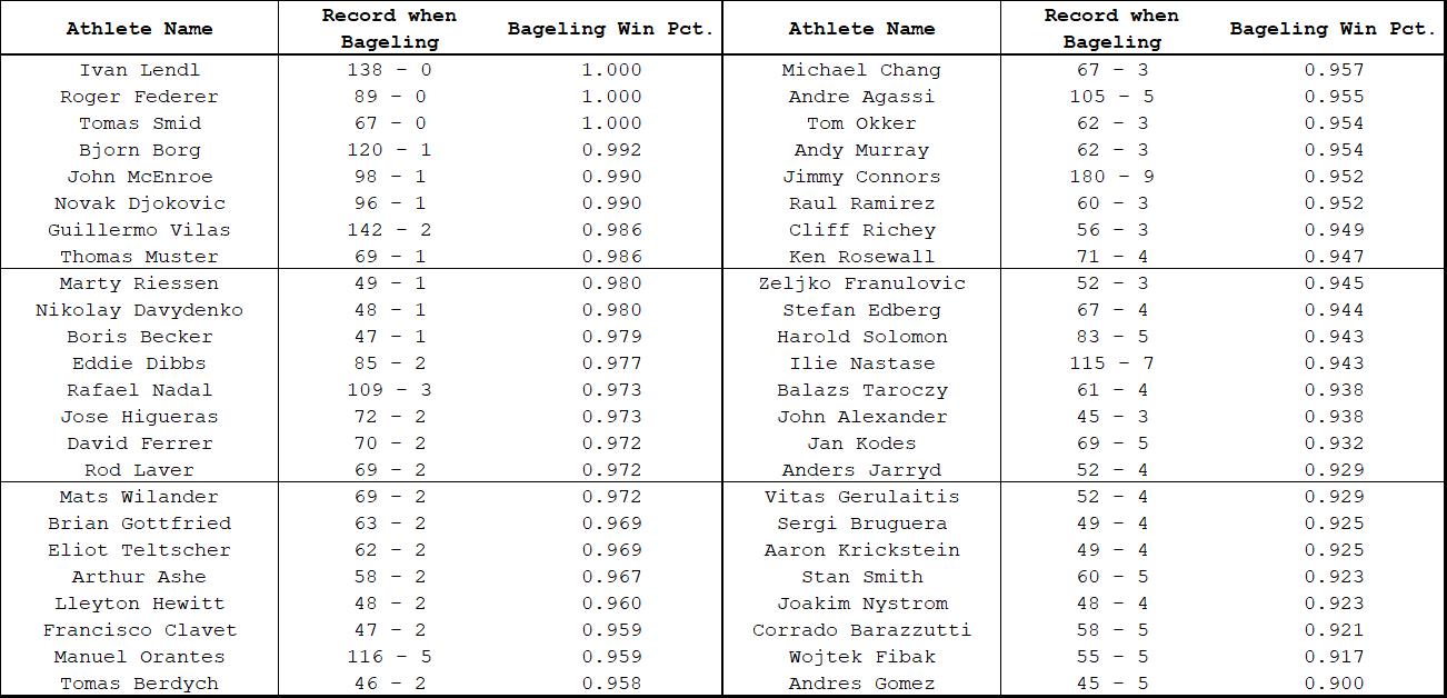 Incredibly, Ivan Lendl, Roger Federer, and Tomas Smid have never lost a match in which they have bageled their opponent. Of course, the bageling win percentage is 90%+ for all of these players, so the majority of them only dropped a few matches at most, but still, perfection is perfection!