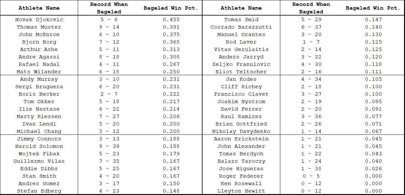 This table really shows the mental fortitude of Novak Djokovic, who has won 5/11 matches in which he has been bageled!