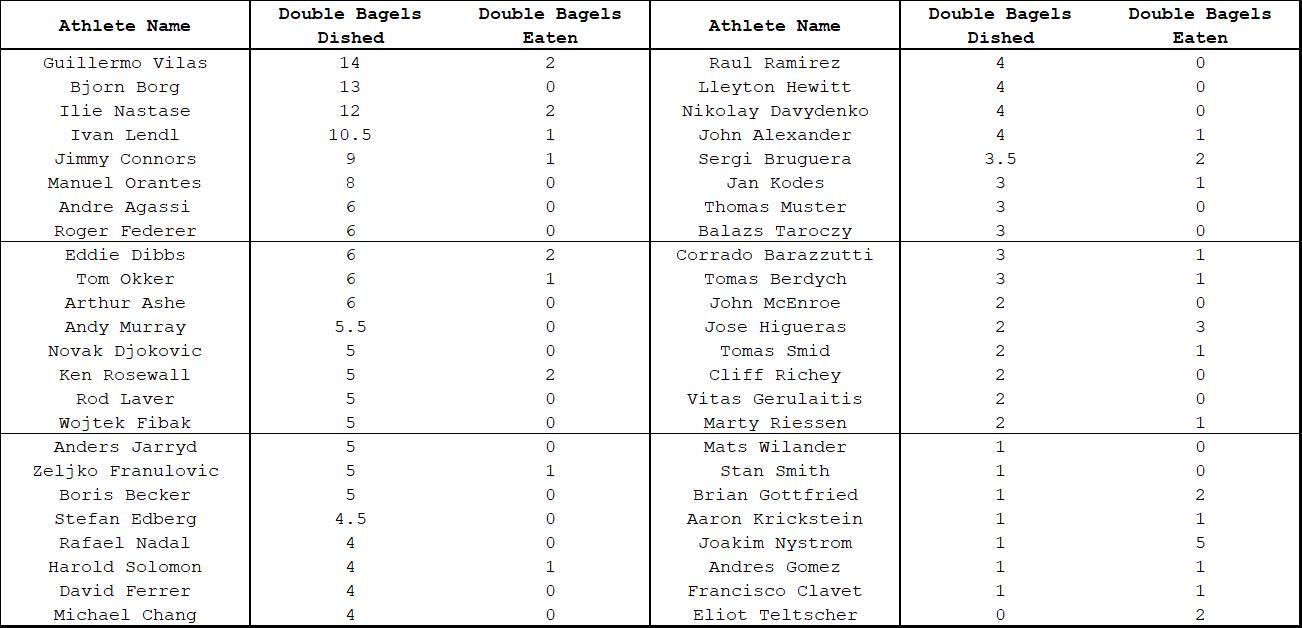 Sometimes, one bagel is simply not enough! Here’s the rundown of when these players dished out or ate multiple bagels in a match. I counted a triple bagel as 1.5 double bagels for tallying purposes.