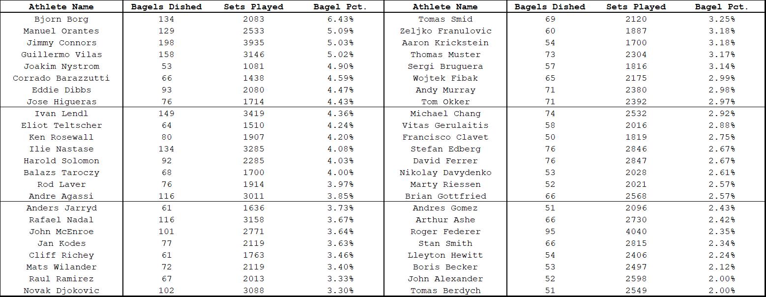 Bjorn Borg, the Ice-Man, cracks the top of the list with a bagel percentage of 6.43% of sets played, or a bagel roughly every 15.5 sets.