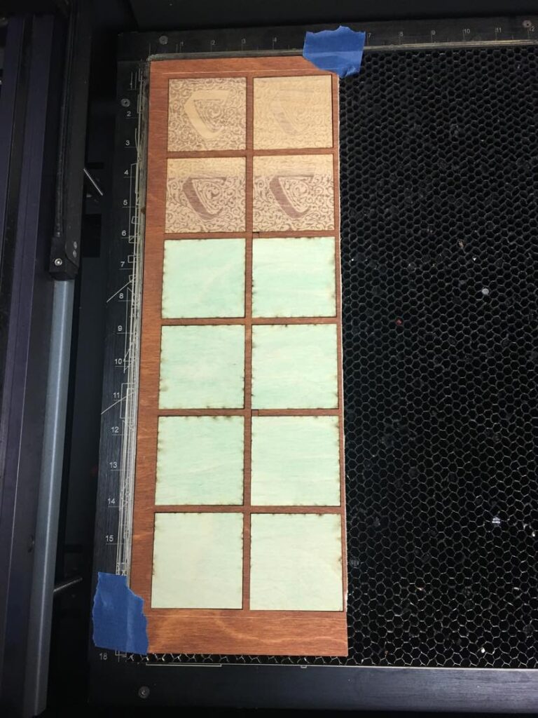One change I made in the design was the vector etching pattern. I wanted the tiles to be double-sided, and to ensure alignment, I separated out each tile with spaces on all four sides. I then etched one side completely before flipping each tile over to etch the other side. This technique worked out quite well, as I had previously used it to recreate the board games The Duke and Jarl – which I will discuss in an upcoming post!