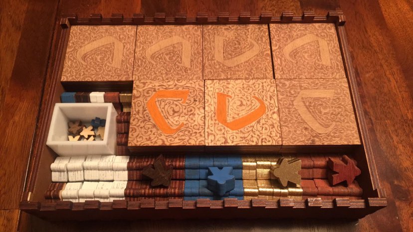 1. Box design: completely brown and devoid of contrast – I originally did etch away the Carcassonne name on the top, but foolishly decided to stain it over. Moreover, the finger joints on the top surface make for an inelegant way of opening and closing the box.