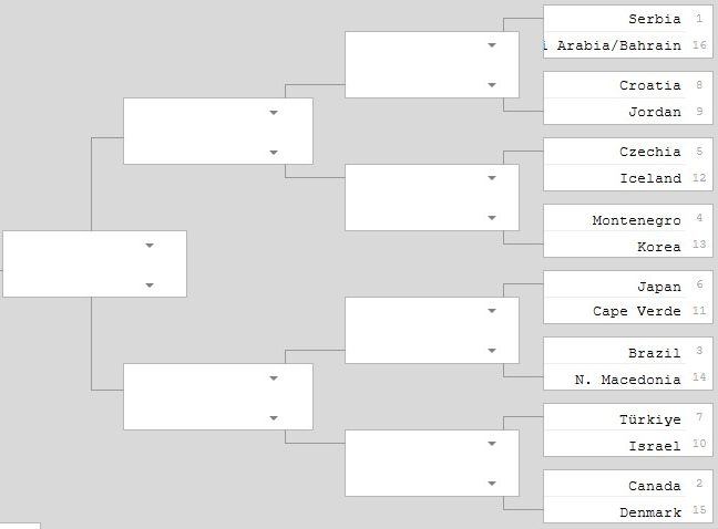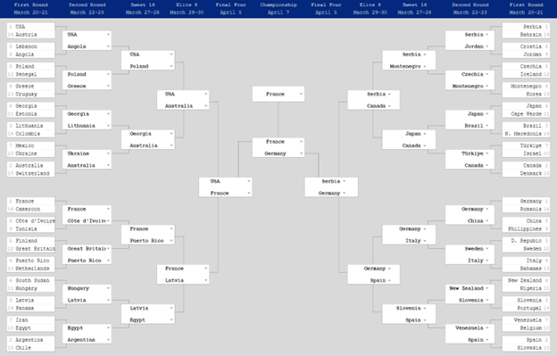 Shown below are the top 16 teams, corresponding to Seeds 1 – 4 in each of the four regions of the bracket. I have a feeling that the winner of the 2025 FIBA Tournament will come from this group.