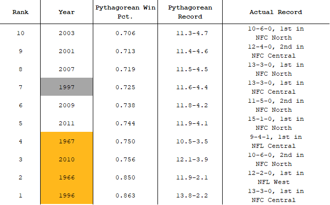 1996 Packers (13-3) |#T-15 regular season overall, Pythagorean win percentage 0.863