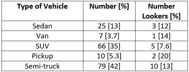 Table 2: Frequency of vehicle types and lookers (n = 187)