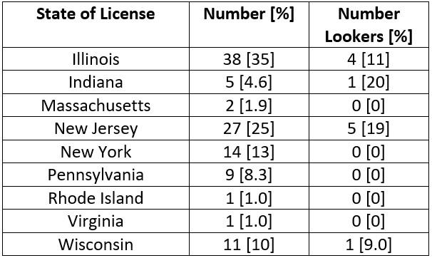 From Table 1, we see that the majority (93%) of vehicles encountered were overtaken by our car, which makes sense as I only recorded vehicles coming from our right, generally corresponding to slower traffic. The majority (83%) of drivers were male, and there was a total of 21 lookers, or 11% that of the total drivers encountered. As seen in Table 2, a plurality of vehicles were of type semi-truck (42%), followed closely by SUVs (35%) and sedans (13%), with a remainder comprised of vans and pickup trucks. The state licenses corresponding to the highest number of vehicles were from Illinois (n = 38), New Jersey (n = 27), and New York (n = 14). Keep in mind that I drove pretty much the entire segment covering Ohio and Pennsylvania, accounting for the limited representation from these two states. Also, I decide to stop recording at sunset (19:32), given that the diminished visibility which would likely dissuade drivers from looking in lieu of keeping their eyes on the road.